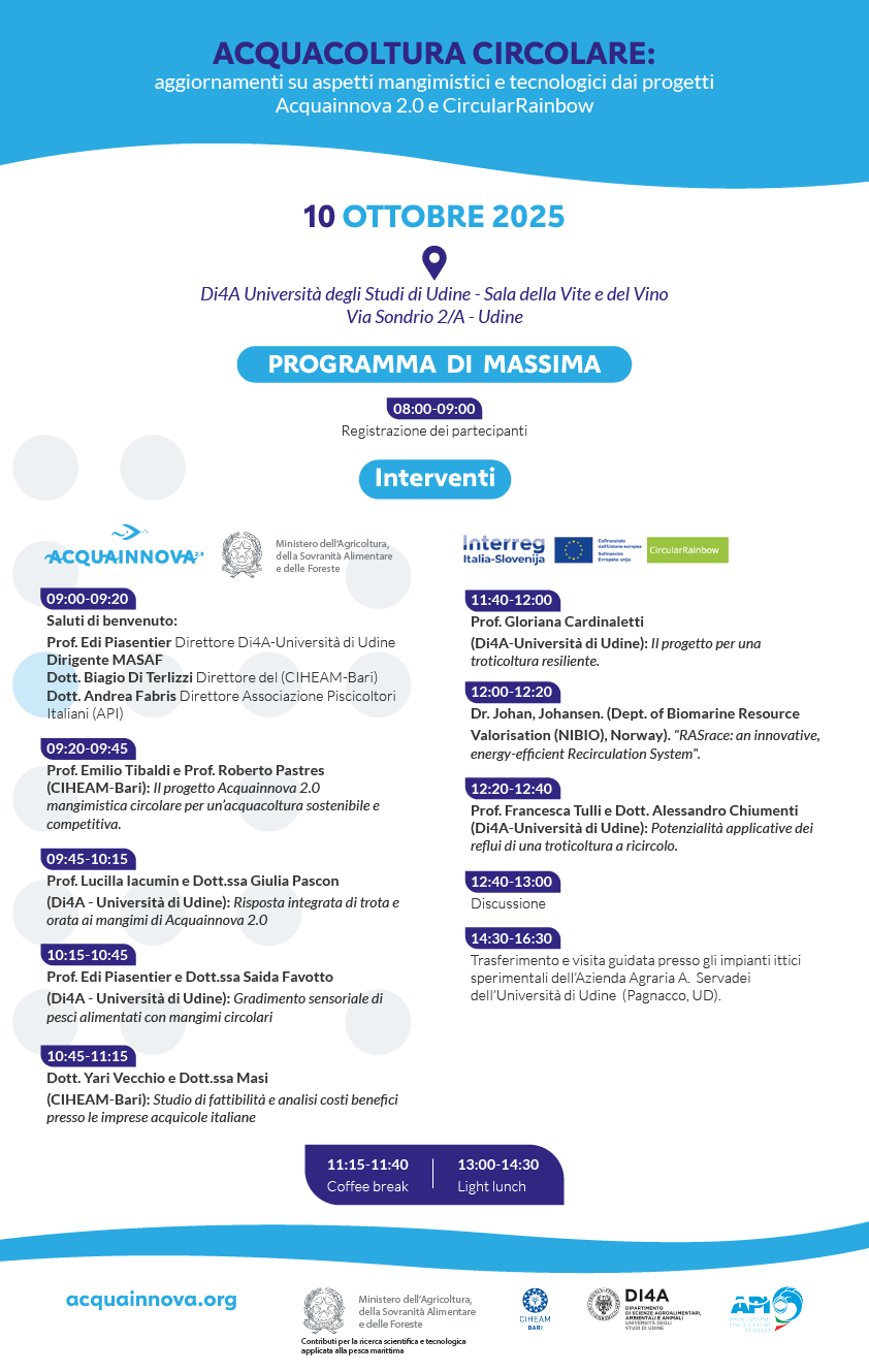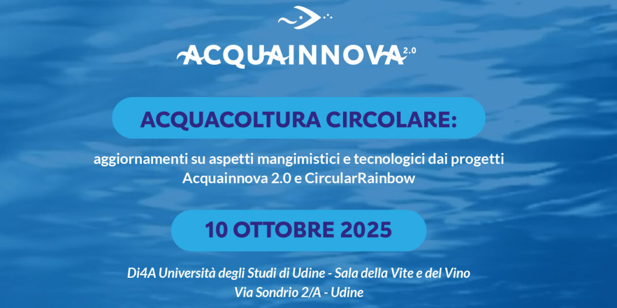 Ottobre 9, 2025Il giorno 10 Ottobre, il Dipartimento di Scienze AgroAlimentari, Ambientali e Animali dell’Università di Udine ospiterà un convegno rivolto agli stakeholders della filiera acquacolturale che affronterà il tema dell’Acquacoltura circolare sotto i profili mangimistico e tecnologico facendo il punto sui risultati finora raggiunti nei progetti ACQUAINNOVA 2.0 e CIRCULAR RAINBOW.